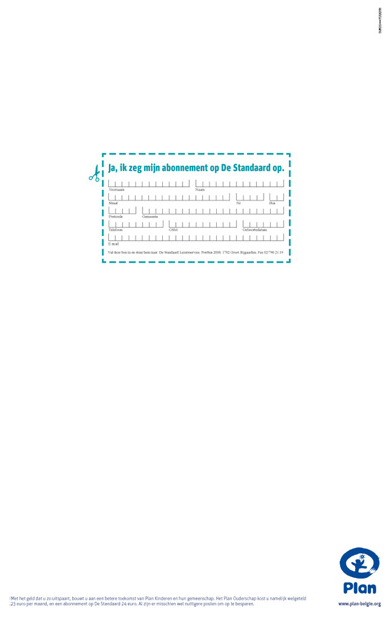 STANDAARD SOLIDARITEITSPRIJS – PLAN Posted on 13/09/201030/10/2010 by flowris Posted in Advertising Zeg je abonnement op de Standaard op en gebruik het geld om een Plan kind te sponsoren. Copy: Steven Goedhart Shortlist 2006