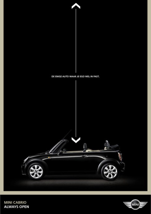 MINI CABRIO – EGO Posted on 19/09/201019/04/2011 by flowris Posted in Advertising, MINI MINI Cabrio, the only car with enough room for your ego. Copy: Steven Goedhart
