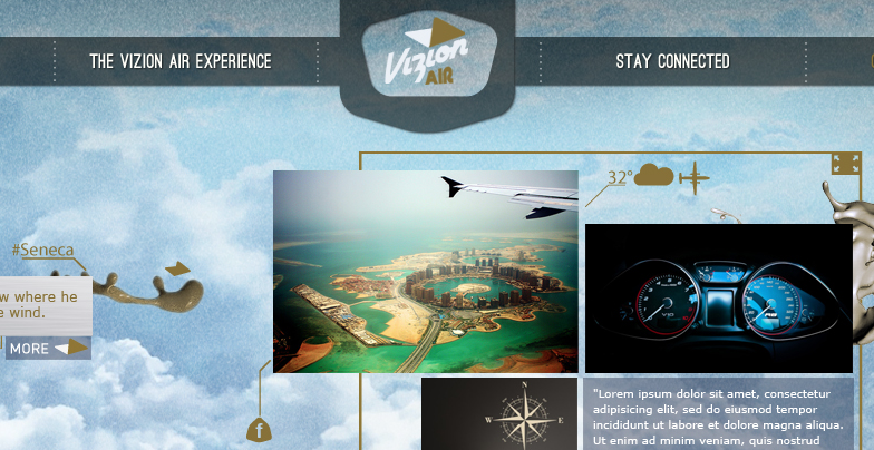 Vizion Air // inspirational aircraft Posted on 17/01/201429/01/2023 by flowris Posted in Advertising, commercial work, Graphic Design, logo, webdesign New visual identity / logo / and website are introduced. website: horizontal scrollsite with everytime you visit it you see new “inspiration clouds”. Made at Starss.