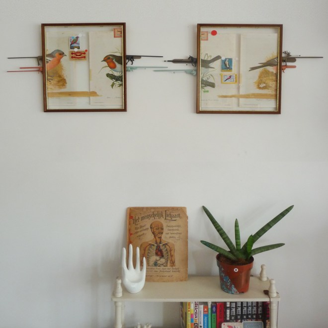 I found these two lovely bird illustrations in a thrift store. After the release from their original frame, I sliced them both in half and reframed them: one cadre holds their heads and the other one holds their backsides.