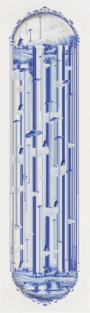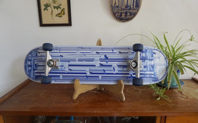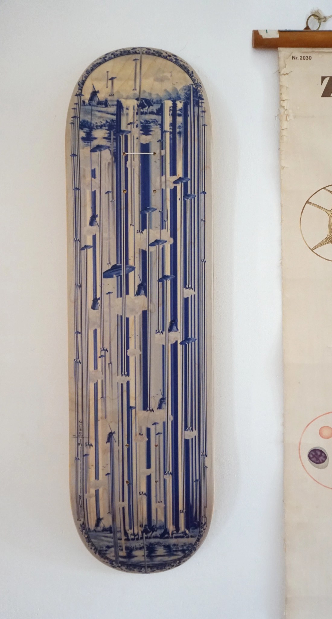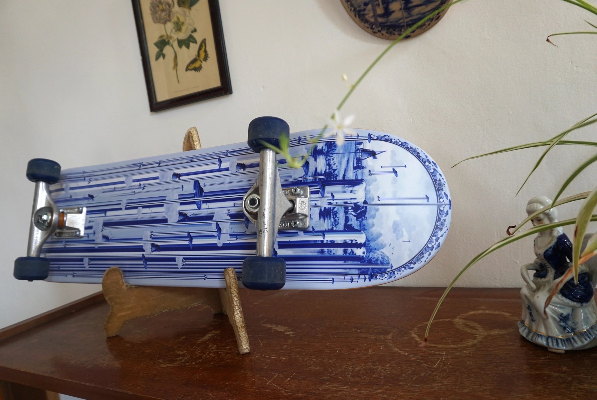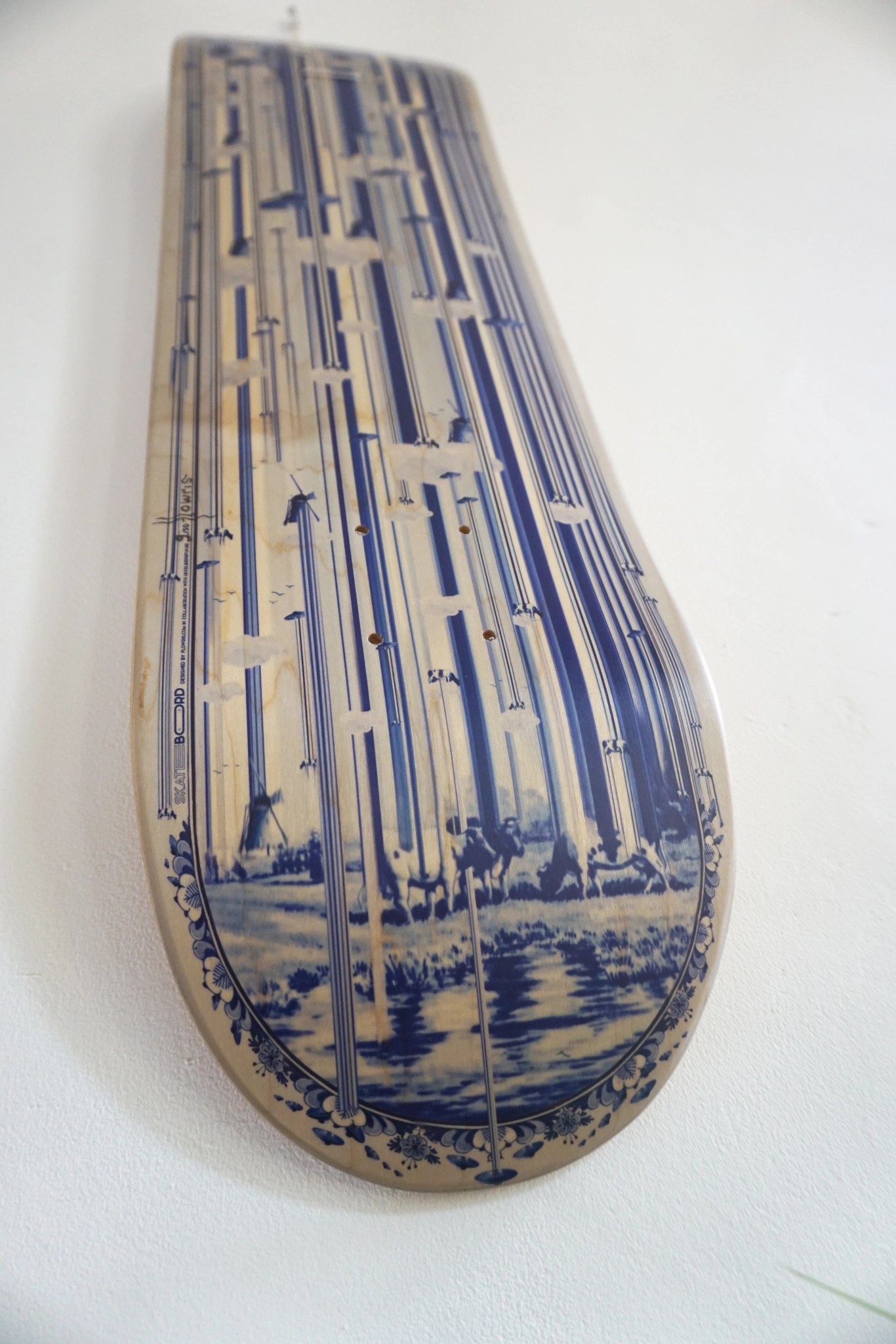 The nose and the tail of the SKATEbord design are similar to a Delft Blue plate (plate = ‘bord’ in Dutch) and the rest of the deck is elongated with a glitch effect. Within this glitch, Delft Blue cows are beamed up by flying saucers. The interplay of two opposite worlds (fragile ceramics & rough skatescene) gives the SKATEbord its surreal, dynamic vibe.